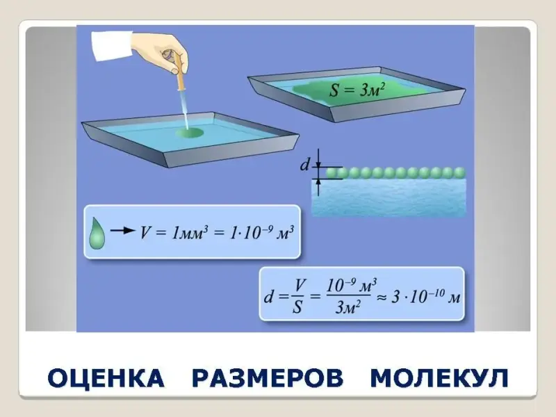 Вывод: все вещества состоят из молекул и между молекулами есть промежутки! Но, все тела мы видим сплошными. (слайд № 8) Дело в том, что молекулы настолько малы, что оптической силы глаза не достаточно для видения молекул. Поможет в определении размера молекул эксперимент. (слайд № 9) Размер молекулы масла d=1,6*10-9м=1,6 нм (нанометр).