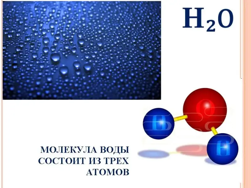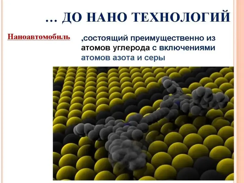 Не смотря на свои столь малые размеры, молекулы состоят ещё из более мелких частиц - атомов. Например, наименьшая частица воды - молекула воды. (слайд № 10) Она состоит их трех атомов: двух атомов Н - водорода и одного атома О - кислорода. Знания об атомах сегодня в науке позволяют создавать не только автомобили или электромобили, но и наномобили. (слайд № 11)