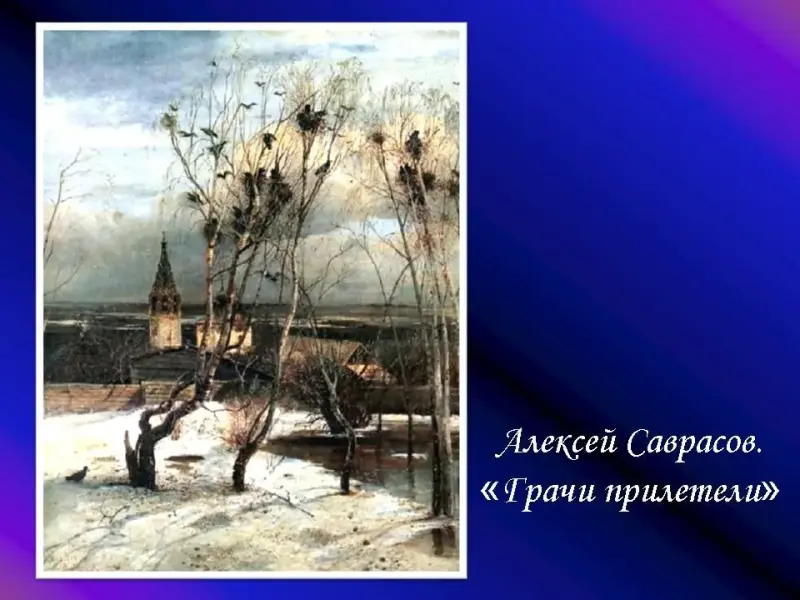 Вспомним картину пейзажиста Алексея Кондратьевича Саврасова "Грачи прилетели". Как поэтично художник изобразил приход ранней весны: рыхлый, розоватый снег, прозрачные дали, чету прилетевших грачей! Смотришь на картину, и, кажется, что она наполнена их криком.