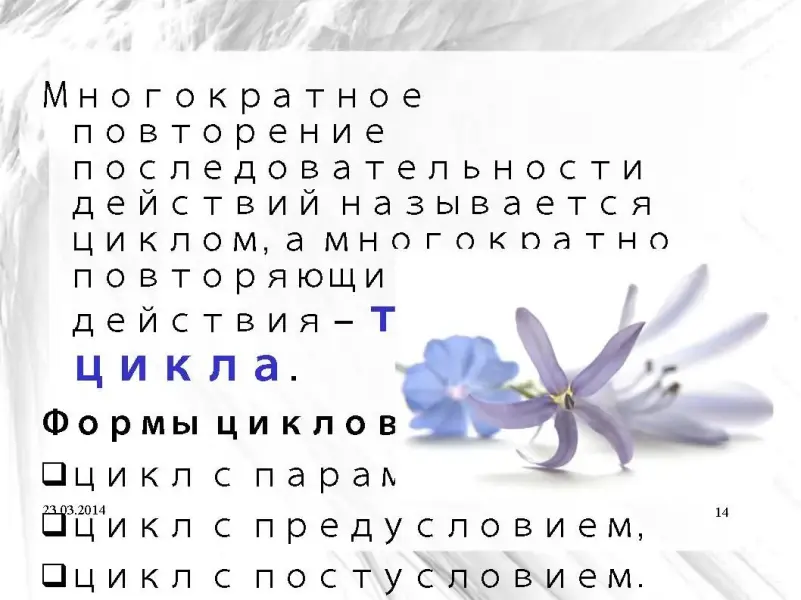Многократное повторение последовательности действий называется циклом, а многократно повторяющиеся действия - телом цикла.