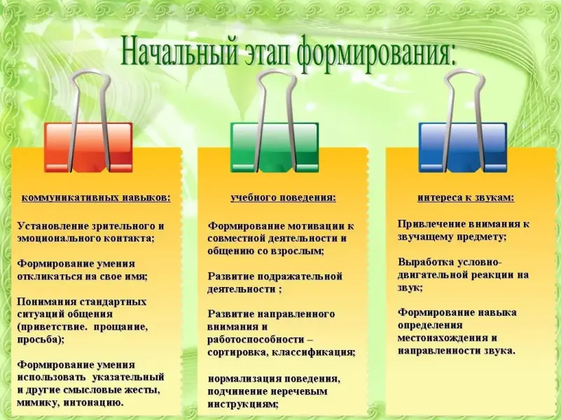 2. Формирование: коммуникативных навыков; учебного поведения; начального интереса к звукам.