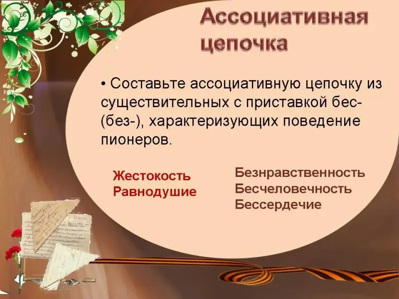 Составьте ассоциативную цепочку из существительных с приставкой бес- (без-), характеризующих поведение пионеров.