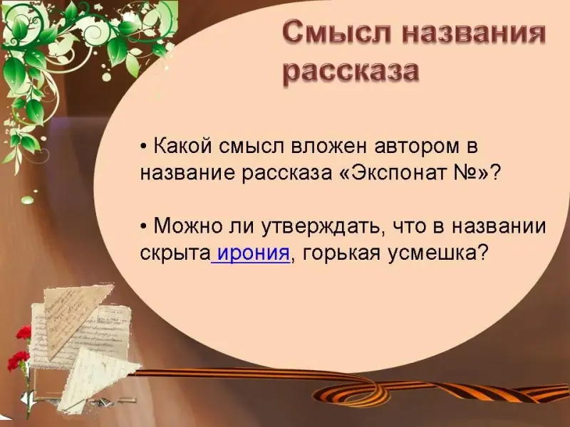 Слово учителя: В рассказе "Экспонат №.." Борис Васильев обличает бесчеловечную, разлагающую силу формализма. Бюрократический стиль мышления у взрослых невольно накладывает свой отпечаток и на молодое поколение, воспитывая у них такое же формальное отношение к делу. "Процентомания", стремление любой ценой выполнить обязательства, взятые накануне Дня Победы, толкают пионеров на "жестокие" поступки. Так, для Анны Федотовны письма - это память о сыне, целая жизнь, а для пионеров всего лишь забытый экспонат. Ставя на первое место мероприятие само по себе, дети забыли о законах человечности, нравственности и просто внимательного отношения к матери, потерявшей на войне единственного сына.