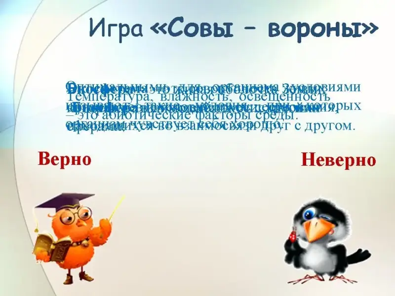 Формируются две равные команды - Совы и Вороны. Обе команды выстраиваются лицом друг к другу на расстоянии одного метра. Педагог произносит фразу, содержащую некое утверждение, и, если оно соответствует действительности, Совы (мудрые птицы и знают ответы на все вопросы) начинают махать "крыльями". Если же утверждение не соответствует действительности, то Вороны (хитрые птицы) машут "крыльями". Игроки, которые ошиблись переходят в команду соперников. (Слайд 4).