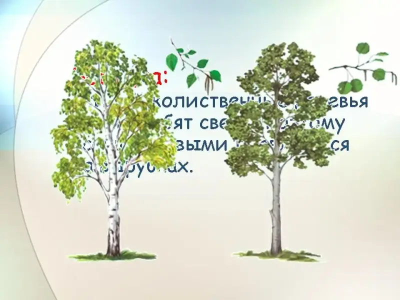 - Эти мелколиственные деревья очень любят свет и поэтому всегда первыми появляются на вырубках (береза, осина) (Слайд 5).