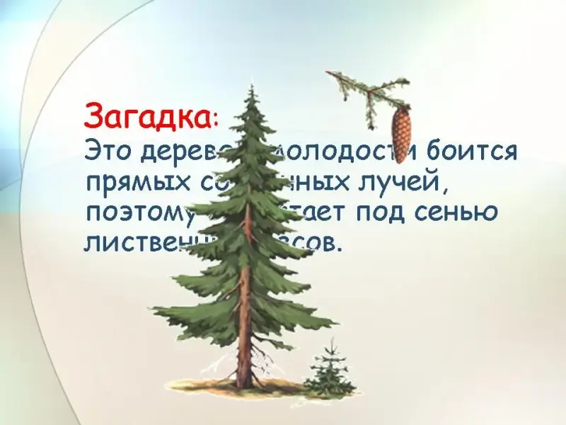 - Это дерево в молодости боится прямых солнечных лучей, поэтому вырастает под сенью лиственных лесов (ель) (Слайд 6).