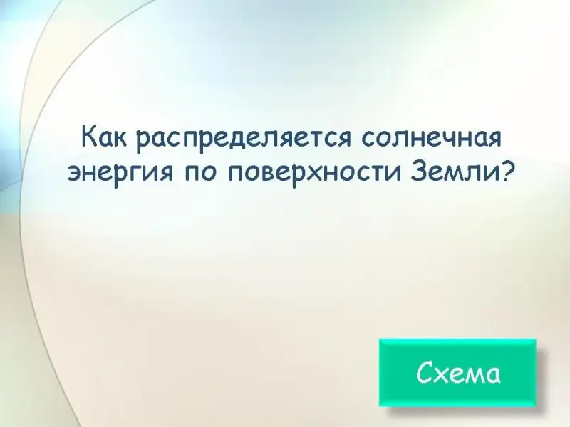 Выслушав и обсудив все предположения учащихся, делаем вывод, что разнообразие климата зависит прежде всего от неравномерности распределения солнечной энергии по поверхности Земли. Из-за наклона земной оси разные области земного шара получают неодинаковое количество солнечной энергии. Рассматривается схема распределения солнечной энергии по поверхности Земли. (Слайд 10).