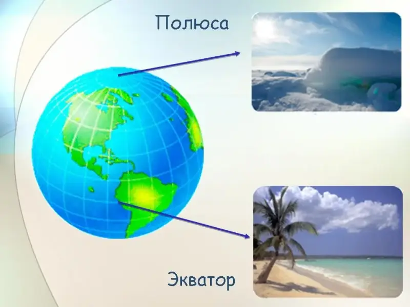 Педагог просит детей показать наиболее отличающиеся друг от друга по количеству тепла места на земном шаре - полюса и экватор. (Слайд 11).