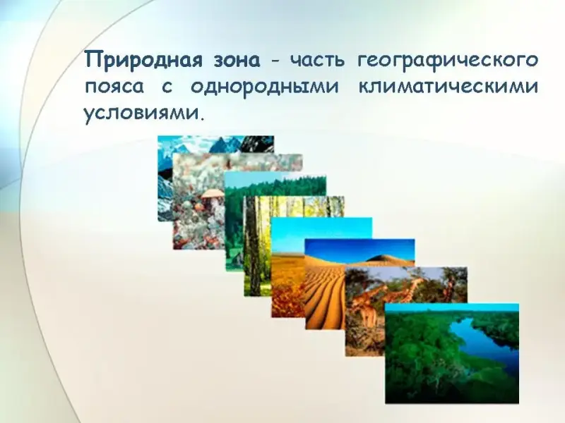 Природная зона - часть географического пояса с однородными климатическими условиями. Природные зоны определяются растительностью и животным миром, населяющими их территорию. Природные зоны формируются прежде всего под влиянием тепла и влаги, получаемых территорией. (Слайд 12).