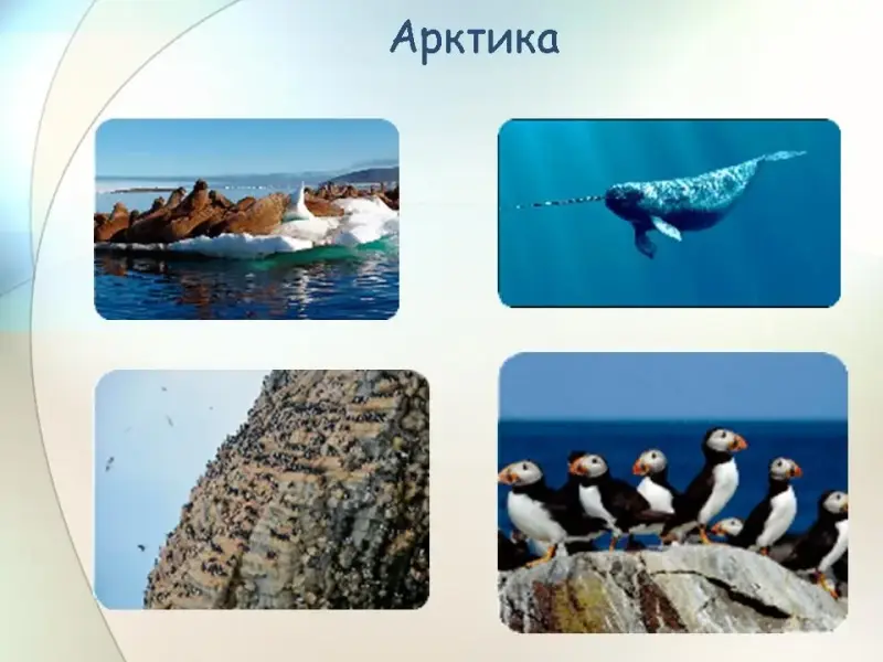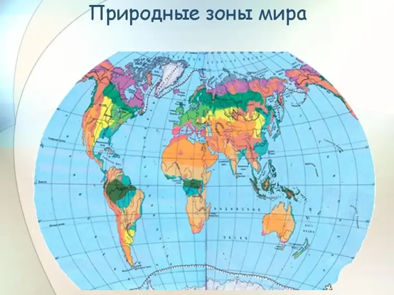 Педагог показывает расположение природных зон на карте мира (Слайд 13). Объясняет, что каждая природная зона является своеобразной экосистемой. Проводит мини экскурсию - презентацию основных природных зон двигаясь от полюса к экватору. В ходе презентации учащиеся знакомятся с характерными для каждой зоны животными и растениями. (Слайды 14-29)