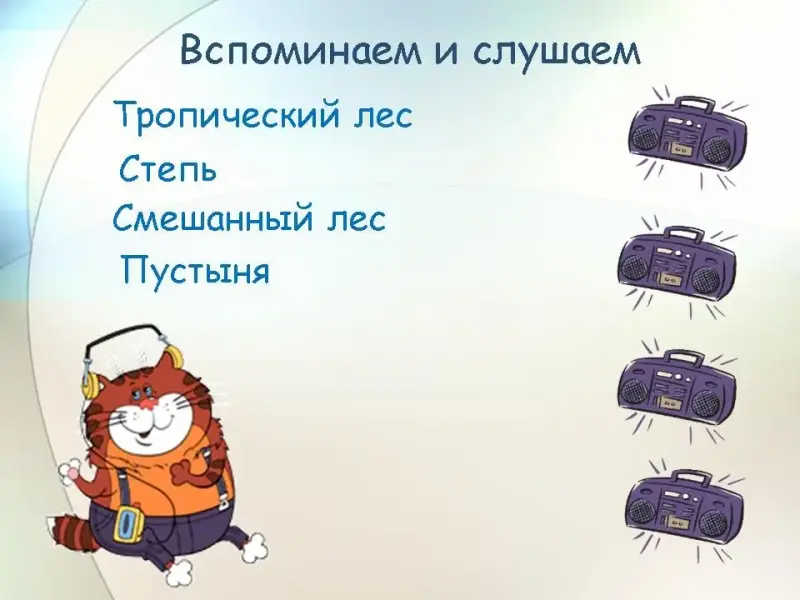 Детям предлагается закрыть глаза, для большей концентрации внимания, и послушать по очереди записи природных звуков: крик обезьян (тропический лес), топот скачущих лошадей (степь), крик кукушки (смешанный лес), песчаную бурю(пустыня) (Слайд 2).
