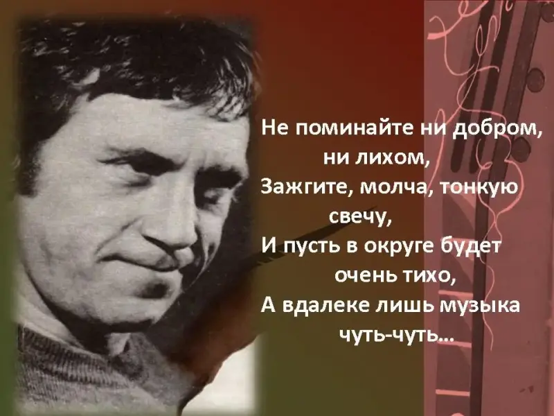 Ведущий: Жизнь. Смерть. Владимир был накоротке с обеими. Не расшаркивался перед жизнью, не лебезил перед смертью. Кто ещё так безоглядно любил жизнь, кто ещё так бесстрашно врезался в её упоительную круговерть?