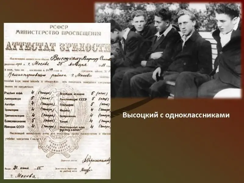 В 1955 году Владимир Высоцкий окончил школу № 186. Аттестат получился хорошим - без троек. Родители, особенно отец, возражали против театрального. Человек прежде должен получить "солидную профессию", а потом уже все остальное. В то время в качестве профориентации по школам рассылали пригласительные билеты. Высоцкий с Кохановским решили поступить туда, откуда придет самый красивый билет. Так они оказались в МИСИ (инженерно-строительном институте). Но новогодняя ночь 1956 года стала "поворотным пунктом" в решении Владимира уйти из вуза.