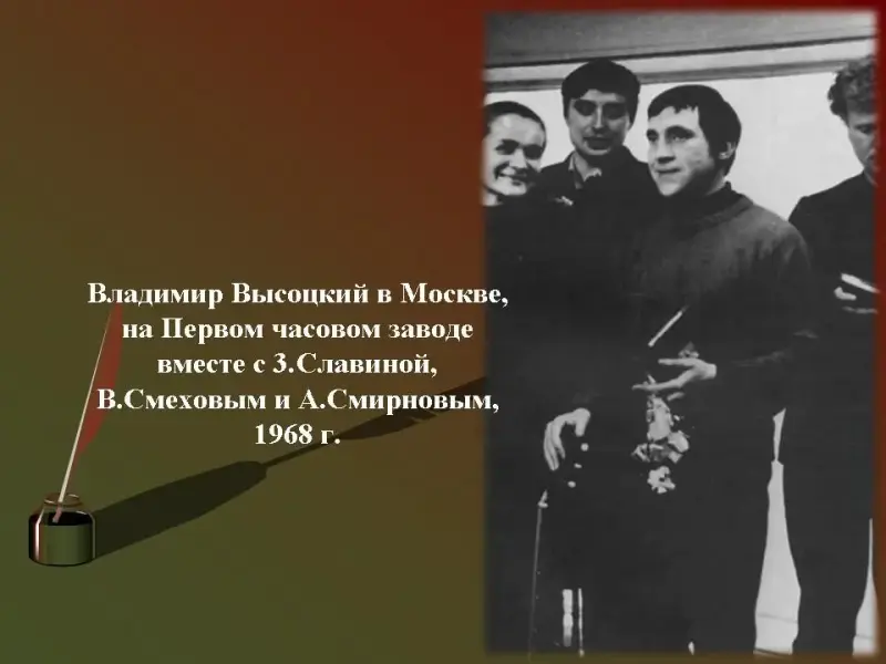 Ведущий: Там появляются первые песни Высоцкого. "Я не думал, - говорил Высоцкий, - что в будущем я буду собирать дворцы и стадионы и здесь, и за рубежом. Я думал, что это будет написано и спето только для маленькой компании моих друзей". Но так случилось, что кто-то нажал кнопку "запись", потом кому-то понравились песни и он захотел их переписать, и так "началось триумфальное шествие этих пленок повсюду по Союзу"