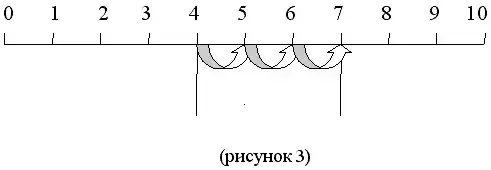Проверка сложения: 4+3=7. Проверяя сложение с помощью линейки, учащиеся шагают по шкале слева направо (рисунок 3).