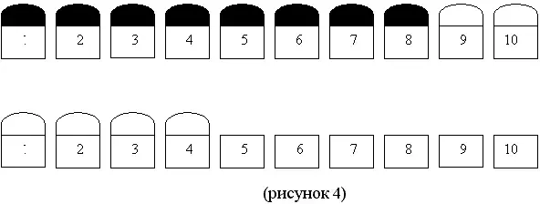 В верхний ряд карманов наборного полотна выставляется 8 одноцветных фишек, а в нижний выставляется 6 фишек другого цвета. После дополнения до 10 фишек первого ряда фишек из второго ряда (переставляются последние фишки) находится результат сложения: 10+4=14 (рисунок 4).
