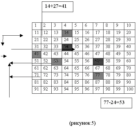 В виде игры "Светофор" можно проводить проверку сложения и вычитания с помощью таблицы чисел от 1 до 100. К таблицеизготавливаются три разноцветные рамки (красная, желтая и зеленая), кот орые позволяют фиксировать числа внутри таблицы (рисунок 5). На рисунке зеленая рамка изображена черной линией, желтая - сеткой, а красная - жирной штриховкой.