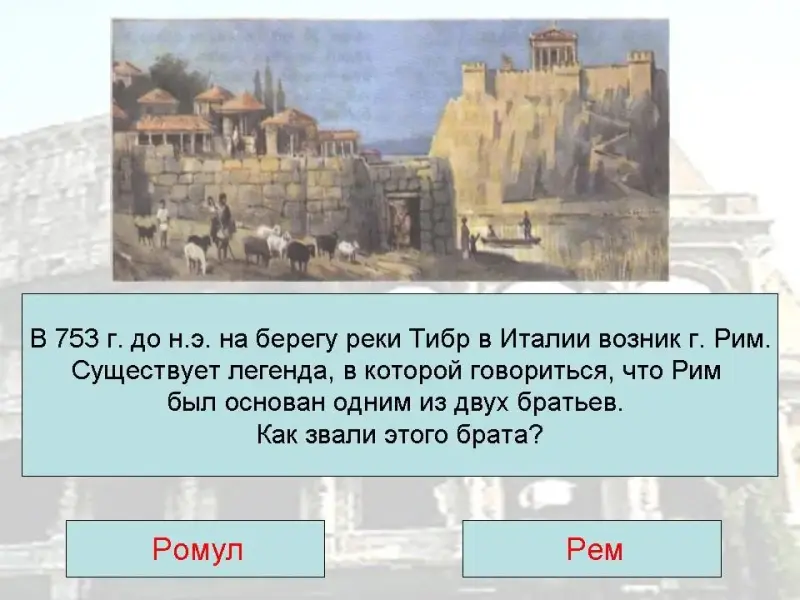 1. В 753 г. до н.э. на берегу реки Тибр в Италии возник город Рим. Существует легенда, в которой говорится, что Рим был основан одним из двух братьев. Как его звали?