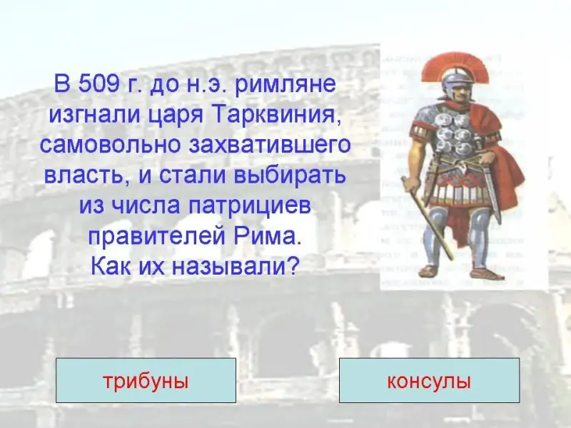 4. В 509 г. до н.э. римляне изгнали царя Тарквиния, самовольно захватившего власть, и стали выбирать из числа патрициев правителей Рима. Как их называли?