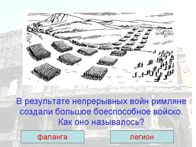 5. В результате непрерывных войн римляне создали большое боеспособное войско. Как оно называлось?