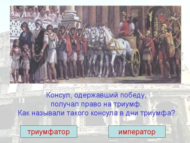 7. Консул, одержавший победу, получал право на триумф. Как называли такого консула в дни триумфа?