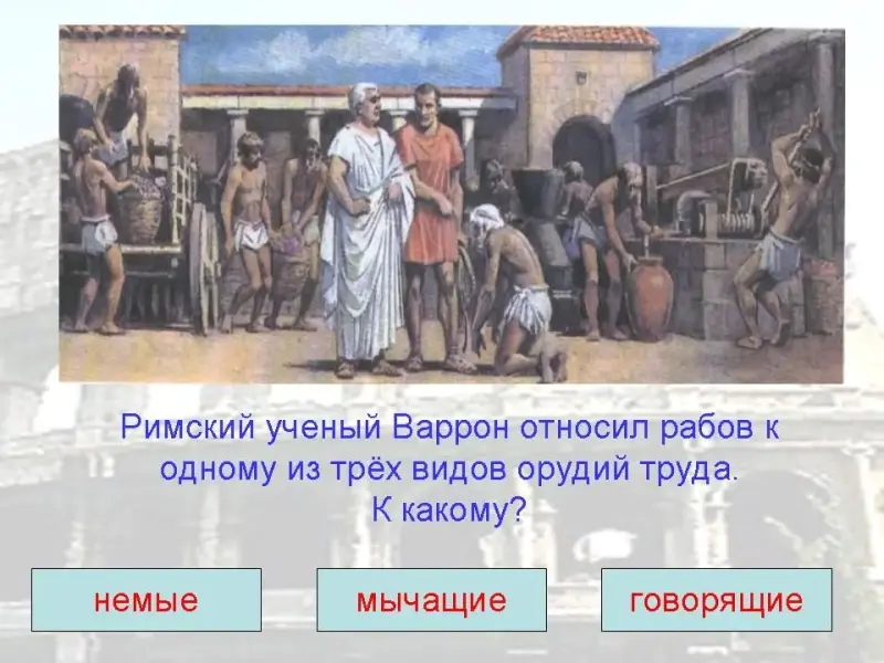 8. Римский ученый Варрон разделял все орудия труда на три группы: говорящие, мычащие и немые. К какой группе он относил рабов?