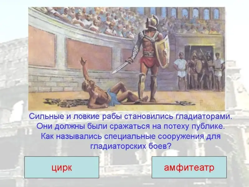 9. Сильные и ловкие рабы становились гладиаторами. Они должны были сражаться на потеху публике. Как назывались специальные сооружения для гладиаторских боев?