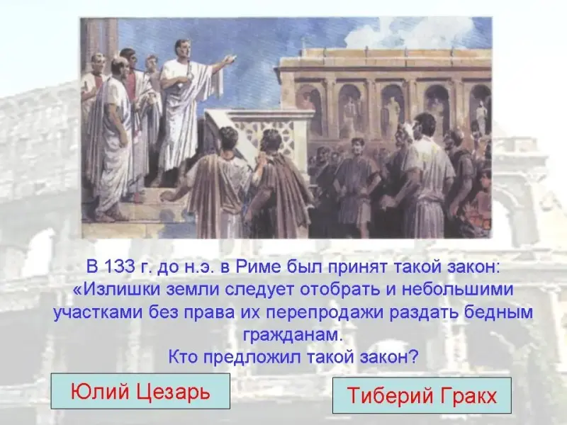 10. В 133 г. до н.э. в Риме был принят такой закон: "Излишки земли следует отобрать и небольшими участками без права их продажи раздать бедным гражданам. Кто предложил такой закон?