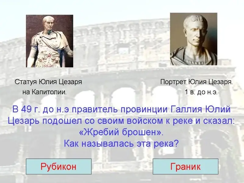 13. В 49 г. до н.э. правитель провинции Галлия Юлий Цезарь подошел со своим войском к реке и сказал: "Жребий брошен!" Как называлась эта река?
