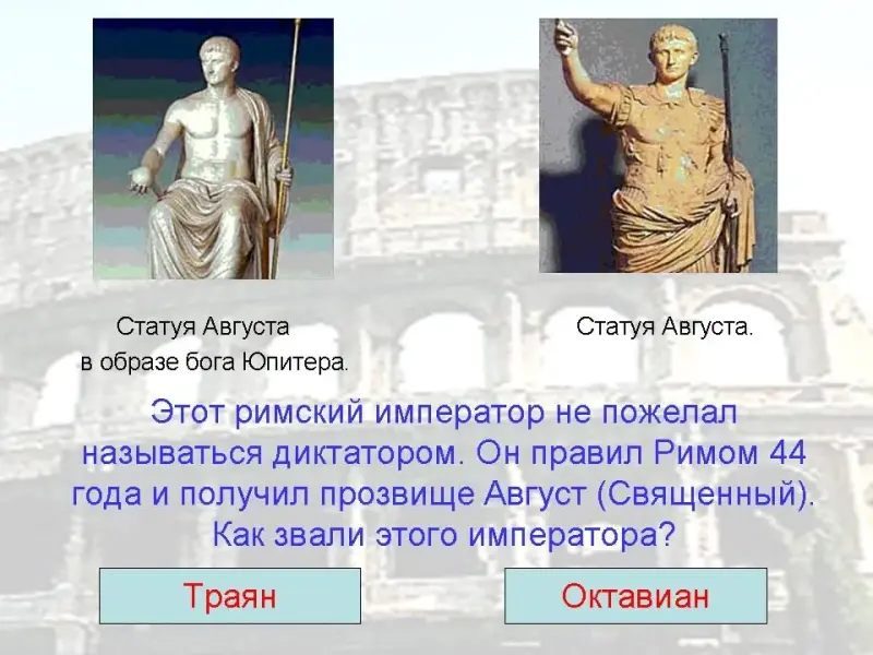 15. Этот римский император не пожелал называться диктатором. Он правил Римом 44 года и получил прозвище - "Август" (Священный). Как звали этого императора?