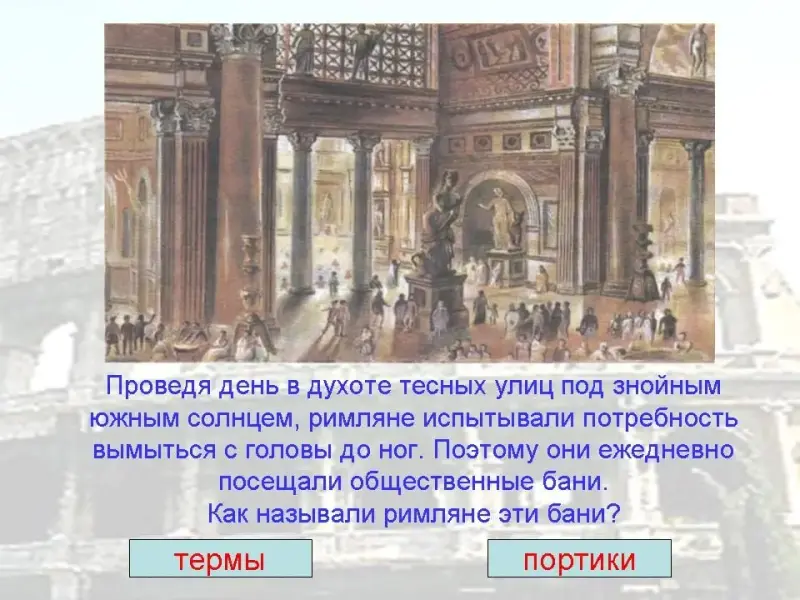 18. Проведя день в духоте тесных улиц под знойным южным солнцем, римляне испытывали потребность вымыться с головы до ног. Поэтому они ежедневно посещали общественные бани. Как называли римляне эти бани?