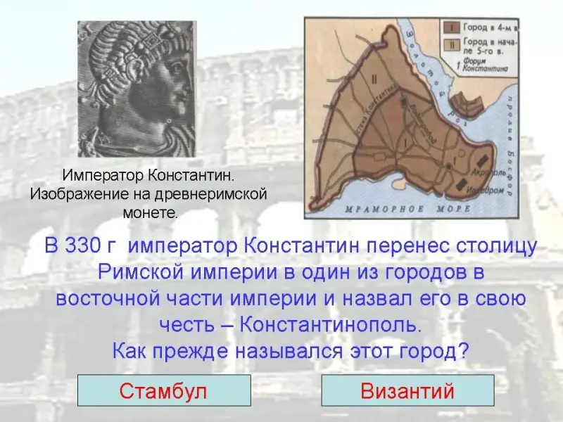 19. В 330 г император Константин перенес столицу Римской империи в один из городов в восточной части империи и назвал его в свою честь - Константинополь. Как прежде назывался этот город?