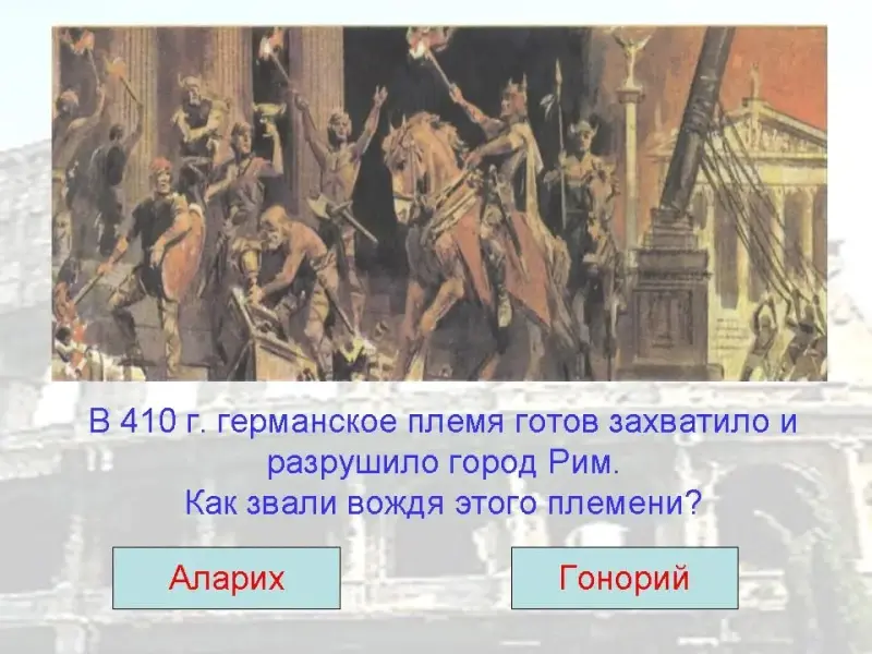20. В 410 г. германское племя готов захватило и разрушило город Рим.