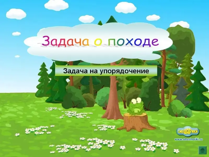 Вступительное слово учителя: Ребята, сейчас мы с вами отправимся в сказочную страну Смешландию и попробуем справиться с заданиями, которые её жители приготовили для вас. Каждому из вас я раздам карточку с заданиями. В ней вы будете по ходу игры отмечать верный ответ. Заданий будет три. В конце игры мы с вами проверим, как каждый из вас справился с задачками, и подробно разберём каждую (слайд 1).