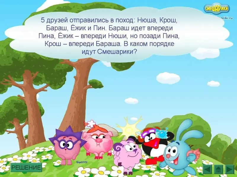 Развивающая игра "Задачи от Смешариков" – игровой момент к уроку информатики по теме "Преобразование информации в рассуждении". 5-й класс