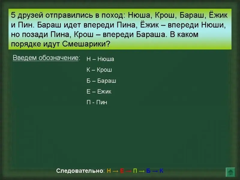5 друзей отправились в поход: Нюша, Крош, Бараш, Ёжик и Пин. Бараш идет впереди Пина, Ёжик - впереди Нюши, но позади Пина, Крош - впереди Бараша. В каком порядке идут Смешарики?