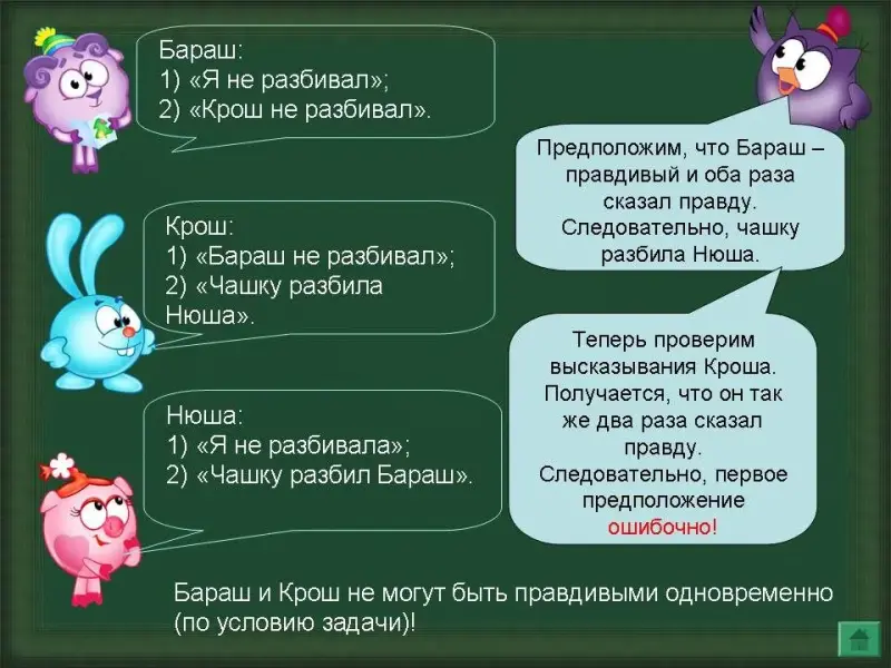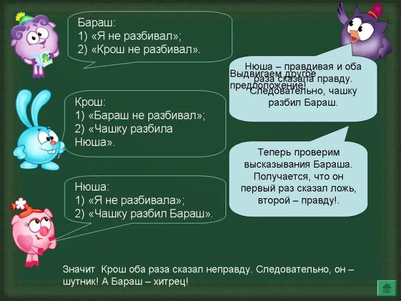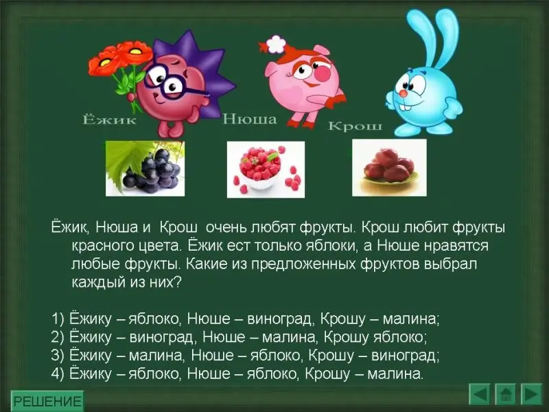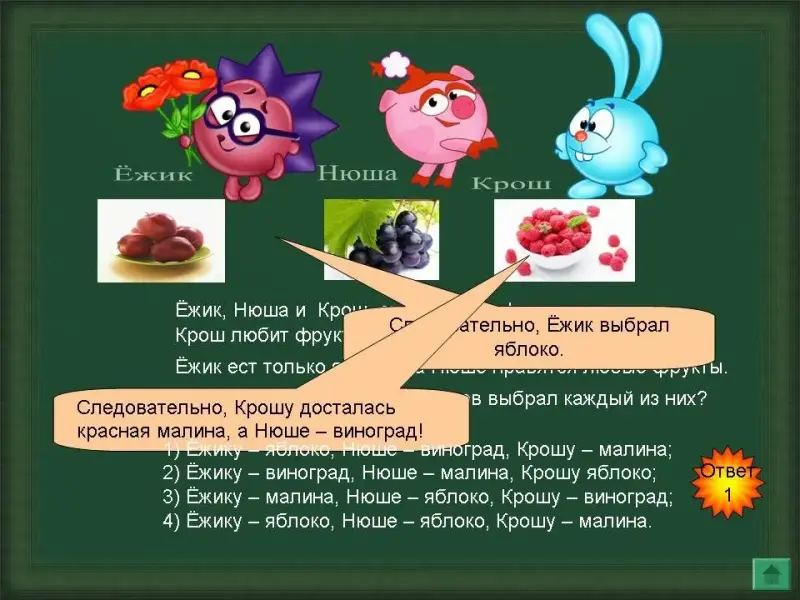 Учитель: Герои Смешариков не похожи друг на друга, у каждого Смешарика свой характер, свои умения, взгляд на мир и увлечения. Среди них нет плохих героев. Смешарики очень дружны, они любят ходить в гости друг к другу. Все праздники они празднуют вместе, а если у одного из Смешариков случается беда все стараются прийти ему на помощь. И вот решили они провести интеллектуальную игру, чтобы определить, кто самый сообразительный. Подготовили задачи, а задачи не простые, а логические. Чтобы решить такую задачу вы должны будете проводить логические рассуждения, взвешивать различные варианты и делать некоторый выбор.