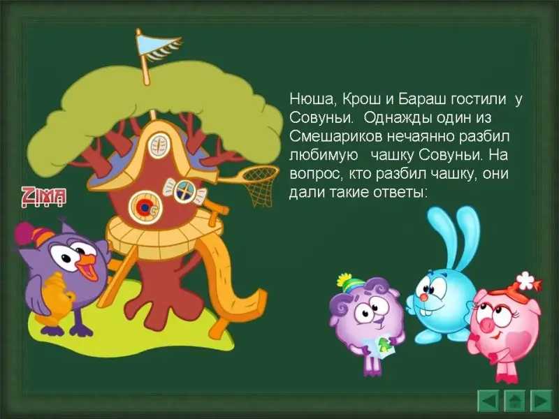Нюша, Крош и Бараш гостили у Совуньи. Однажды один из Смешариков нечаянно разбил любимую чашку Совуньи. На вопрос, кто разбил чашку, они дали такие ответы: