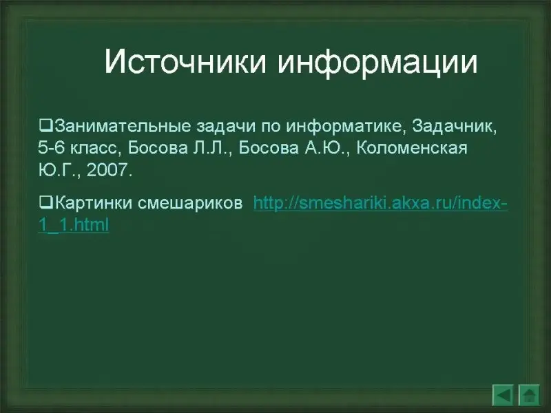 - Занимательные задачи по информатике, Задачник, 5-6 класс, Босова Л.Л., Босова А.Ю., Коломенская Ю.Г., 2007.