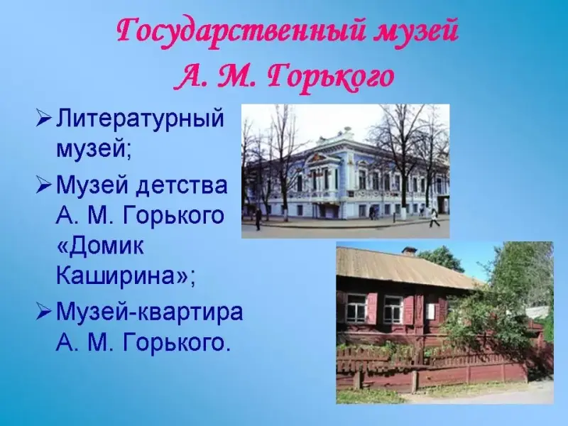 - Имя А. М. Горького неразрывно связано с Нижним Новгородом. В настоящее время в городе создан "Государственный музей А. М. Горького". Он представляет собой музей-объединение трех литературно-мемориальных музеев: