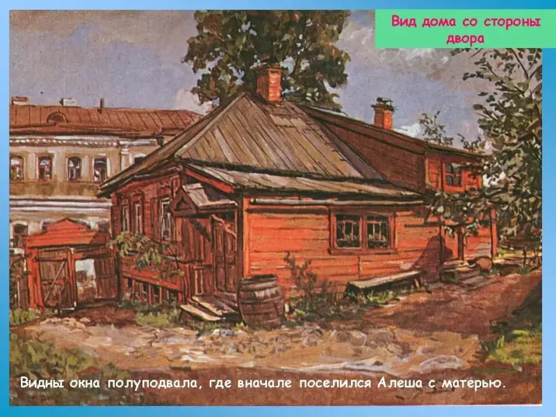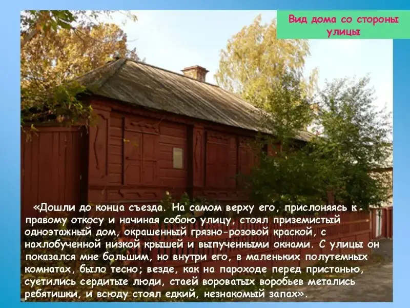 Так вспоминает А. М. Горький в повести "Детство" свой приезд из Астрахани в Нижний Новгород в дом своего деда: "Дошли до конца съезда. На самом верху его, прислоняясь к правому откосу и начиная собой улицу, стоял приземистый одноэтажный дом, окрашенный грязно-розовой краской, с нахлобученной низкой крышей и выпученными окнами. С улицы он показался мне большим, но внутри его, в маленьких, полутёмных комнатах, было тесно; везде, как на пароходе перед пристанью, суетились сердитые люди, стаей вороватых воробьёв метались ребятишки, и всюду стоял едкий, незнакомый запах".