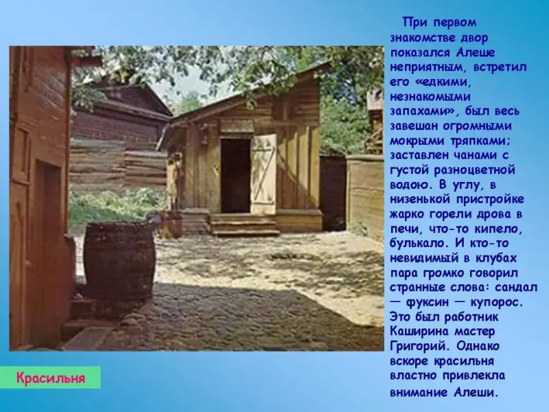 При первом знакомстве двор показался Алеше неприятным, встретил его "едкими, незнакомыми запахами", был весь завешан огромными мокрыми тряпками, заставлен чанами с густой разноцветной водою. В углу, в низенькой пристройке жарко горели дрова в печи, что-то кипело, булькало. И кто-то невидимый в клубах пара громко говорил странные слова: сандал - фуксин - купорос. Это был работник Каширина мастер Григорий. Однако вскоре красильня властно привлекла внимание Алеши; его "очень занимало, как ловко взрослые изменяют цвета материй, берут желтую, мочат ее в черной воде, и материя делается густо-синей - "кубовой", полощут серое в рыжей воде, и оно становится красноватым - "бордо". Просто, а непонятно. Мне захотелось самому окрасить что-нибудь". За первым "опытом" последовала жестокая расплата, но и после наказания он часто бывал здесь. Алеша любил приходить в красильню, чтобы поговорить с Григорием. От Григория Алеша многое узнал о жизни Кашириных, о своем отце Максиме Савватьевиче Пешкове.