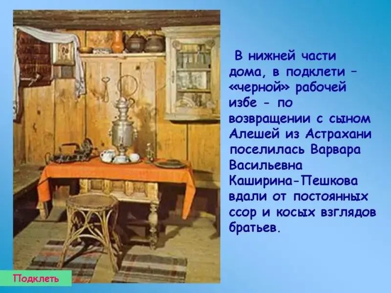 В нижней части дома, в подклети - "черной" рабочей избе - по возвращении с сыном Алешей из Астрахани поселилась Варвара Васильевна Каширина-Пешкова вдали от постоянных ссор и косых взглядов братьев.