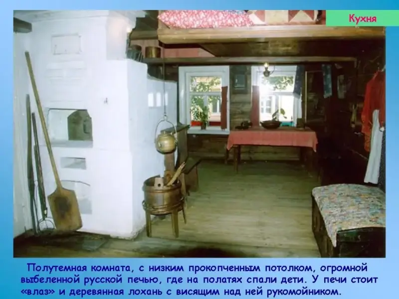Экскурсию по дому начнем с кухни, полутемной комнаты, с низким прокопченным потолком, огромной выбеленной русской печью, где на полатях спали дети. У печи стоит "влаз" и деревянная лохань с висящим над ней рукомойником.