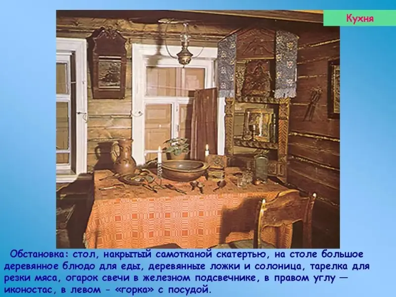 Обстановка: стол, накрытый самотканой скатертью, на столе большое деревянное блюдо для еды, деревянные ложки и солоница, тарелка для резки мяса, огарок свечи в железном подсвечнике, в правом углу - иконостас, в левом - "горка" с посудой. За печью - ухваты, кочерга, полка с кухонной посудой.