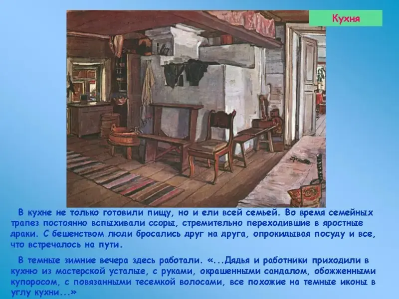 В темные зимние вечера здесь работали. "...Дядья и работники приходили в кухню из мастерской усталые, с руками, окрашенными сандалом, обожженными купоросом, с повязанными тесемкой волосами, все похожие на темные иконы в углу кухни..."
