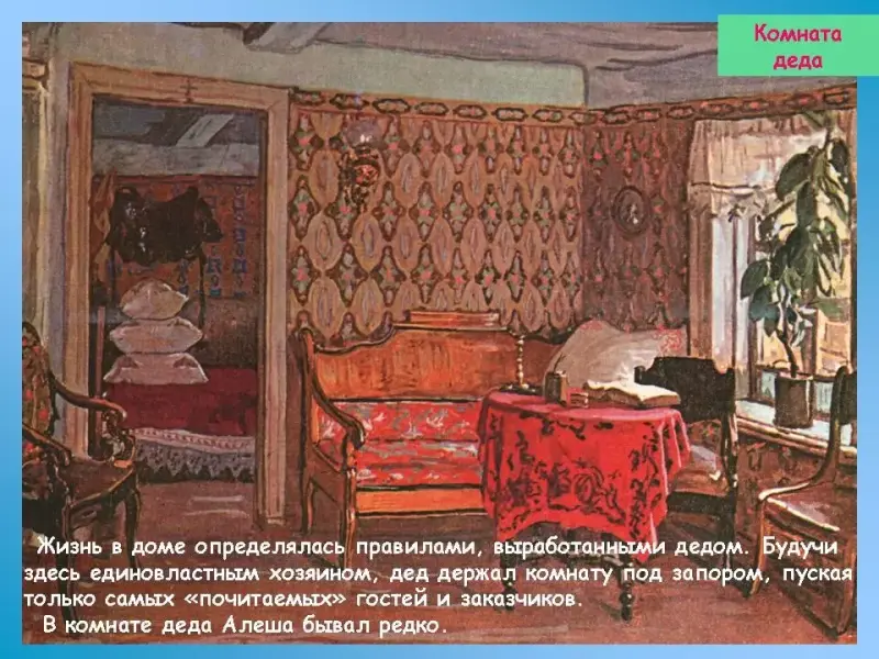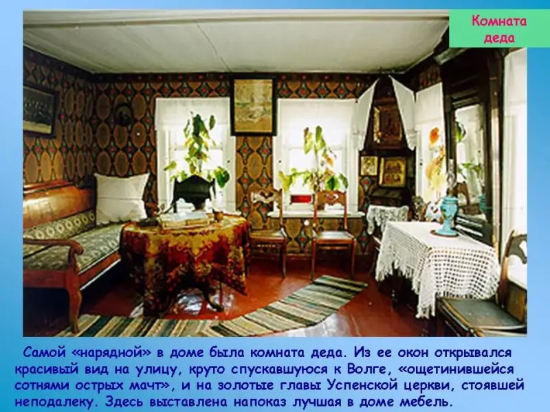 Из кухни дверь ведёт в комнату деда. Она была самой "нарядной" в доме. Из ее окон открывался красивый вид на улицу, круто спускавшуюся к Волге, "ощетинившейся сотнями острых мачт", и на золотые главы Успенской церкви, стоявшей неподалеку. Комната обставлена в строгом соответствии с понятиями и вкусами деда, мелочно кичившегося своим "добром", нажитым ценой тяжелого труда, унижений, "добра", яростно охраняемого от любых посягательств. Здесь выставлена напоказ лучшая в доме мебель.