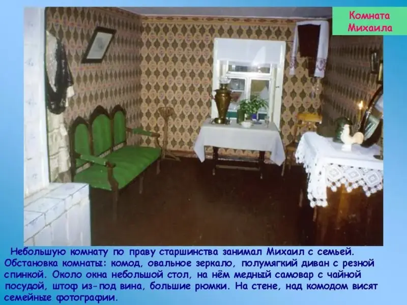 Комната Михаила - дяди А. М. Горького. Небольшую комнату по праву старшинства занимал Михаил с семьей. Обстановка этой комнаты передает колорит быта типичного для мещан второй половины XIX века: стены оклеены обоями, дощатый пол покрашен, побелен потолок. Обстановка комнаты: комод, овальное зеркало, полумягкий диван с резной спинкой. Около окна небольшой стол, на нём медный самовар с чайной посудой, штоф из-под вина, большие рюмки. На стене, над комодом висят семейные фотографии. В комнате можно увидеть парадную одежду: сюртук из чёрного сукна, рубахи-косоворотки, тканые пояса, женские платья.