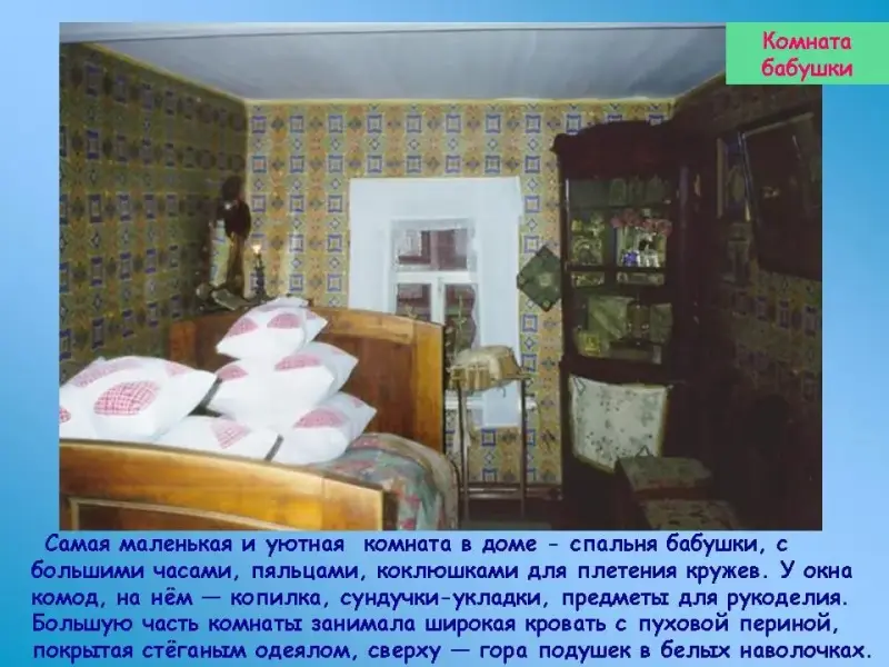Самая маленькая и уютная комната в доме - спальня бабушки, с большими часами, пяльцами, коклюшками для плетения кружев. У окна комод, на нём - копилка, сундучки-укладки, предметы для рукоделия. Большую часть комнаты занимала широкая кровать с пуховой периной, покрытая стёганым одеялом, сверху - гора подушек в белых наволочках. Над кроватью висит чёрная шёлковая тальма, украшенная стеклярусом. За кроватью, в углу - большой деревянный сундук. Над ним развешана женская одежда. В правом углу около небольшого оконца - киот с каширинскими иконами, где день и ночь горела лампада. Все это разнотипные и случайные, на первый взгляд, вещи, но они так удобно расставлены и заботливо начищены - "ухожены" - бабушкиной рукой, что это придает комнате особый уют, приветливость и веселость.