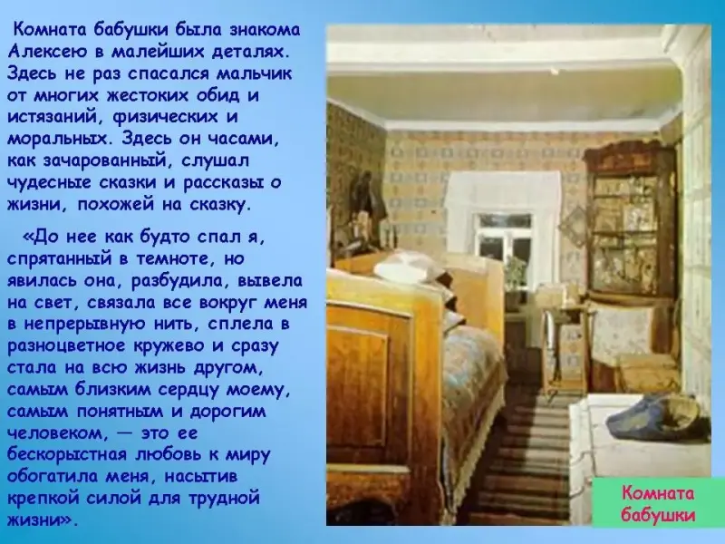 В комнате бабушки не раз спасался мальчик Алеша от многих жестоких обид и истязаний, физических и моральных. Здесь он часами, как зачарованный, слушал чудесные сказки и рассказы о жизни, похожей на сказку. Трудно представить себе, чем была бы его жизнь, не будь около него в эти годы Акулины Ивановны. "До нее как будто спал я, спрятанный в темноте, - вспоминает Алексей Максимович, - но явилась она, разбудила, вывела на свет, связала все вокруг меня в непрерывную нить, сплела в разноцветное кружево и сразу стала на всю жизнь другом, самым близким сердцу моему, самым понятным и дорогим человеком, - это ее бескорыстная любовь к миру обогатила меня, насытив крепкой силой для трудной жизни".